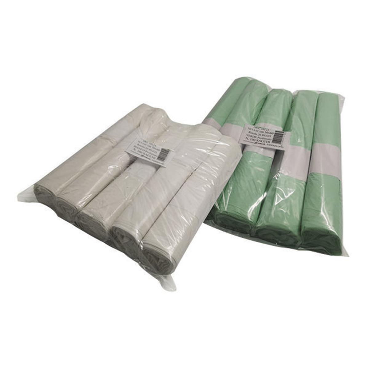 Sacchi colorati con legaccio. Misura cm 50x60 (30 litri). Confezione: 5 rotoli da 20 pz. cad. (100 pz.)