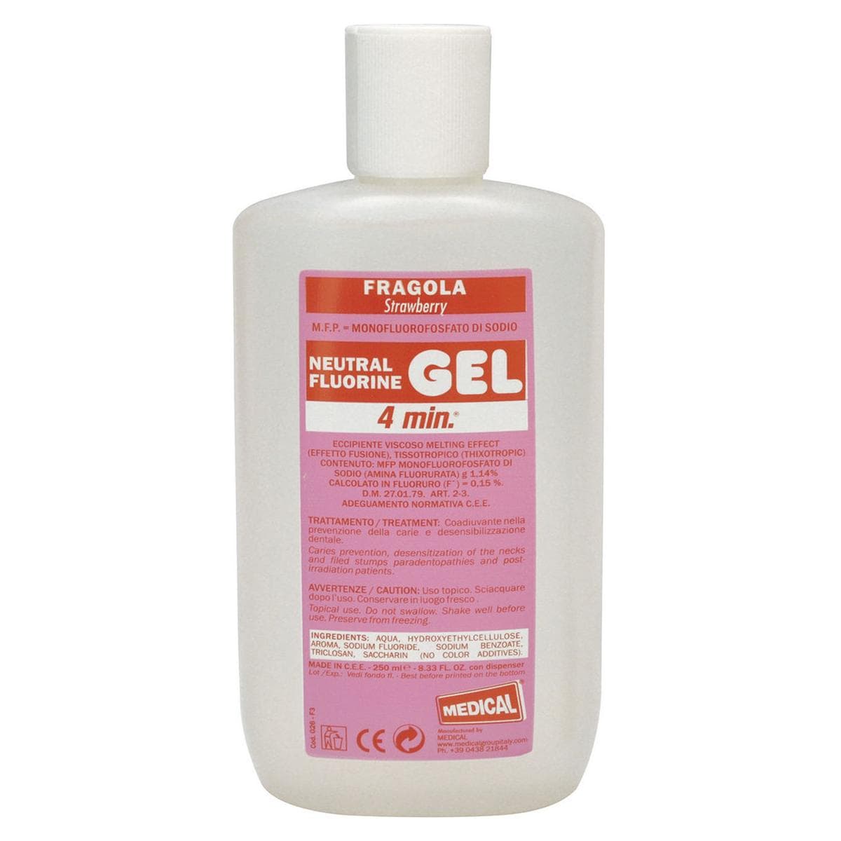 Gel al fluoro senza coloranti disponibile in 2 formulazioni: - A.P.F. acidulato (1 min.), Fluoruro di sodio NaF 0,33% - pH 5,5 per ionoforesi - NEUTRO (4 min.), M.F.P. Monofluorofosfato di sodio 0,33% - pH neutro.